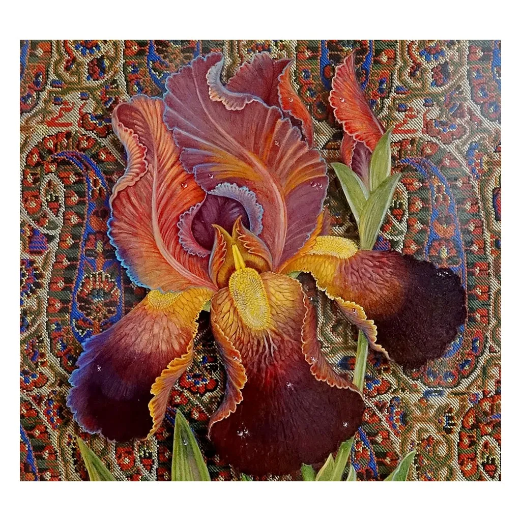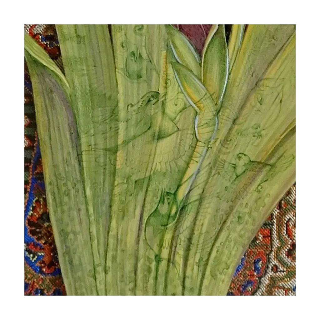 Inspired by a ghazal from Rumi’s Divan of Shams Tabrizi, with the central verse, “Look at the flower within the nightingale’s soul / And from the flower, gaze upon the Universal Intellect,” this piece is a deep dive into mystical symbolism. The iris flower, painted with harmonious curves mirroring the eternal ‘Boteh Jegheh’ in the background, initially captures the viewer’s eye. However, upon closer inspection of the petals and leaves, tiny nightingales are revealed, singing and soaring. This visually narrates the eternal love where the nightingale, consumed by passion for the flower, gives its life, only for the flower to bloom from its essence, embodying the nightingale’s spirit in an unending cycle of life. The signature, “Hu al-Jalil ’95,” adheres to a Safavid tradition where artists humbly presented themselves as mere conduits for divine creation.